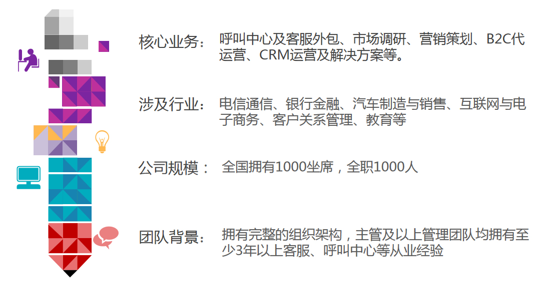 是中(zhōng)國(guó)知名(míng)服務(wù)外包的公(gōng)司之一,公(gōng)司核心業務(wù)為(wèi)呼叫中(zhōng)心外包、市場研究、輿情監測、營銷策劃、電(diàn)子商(shāng)務(wù)等。服務(wù)對象涵蓋政府、通信、IT、金融、汽車(chē)、房地産(chǎn)、教育等行業。